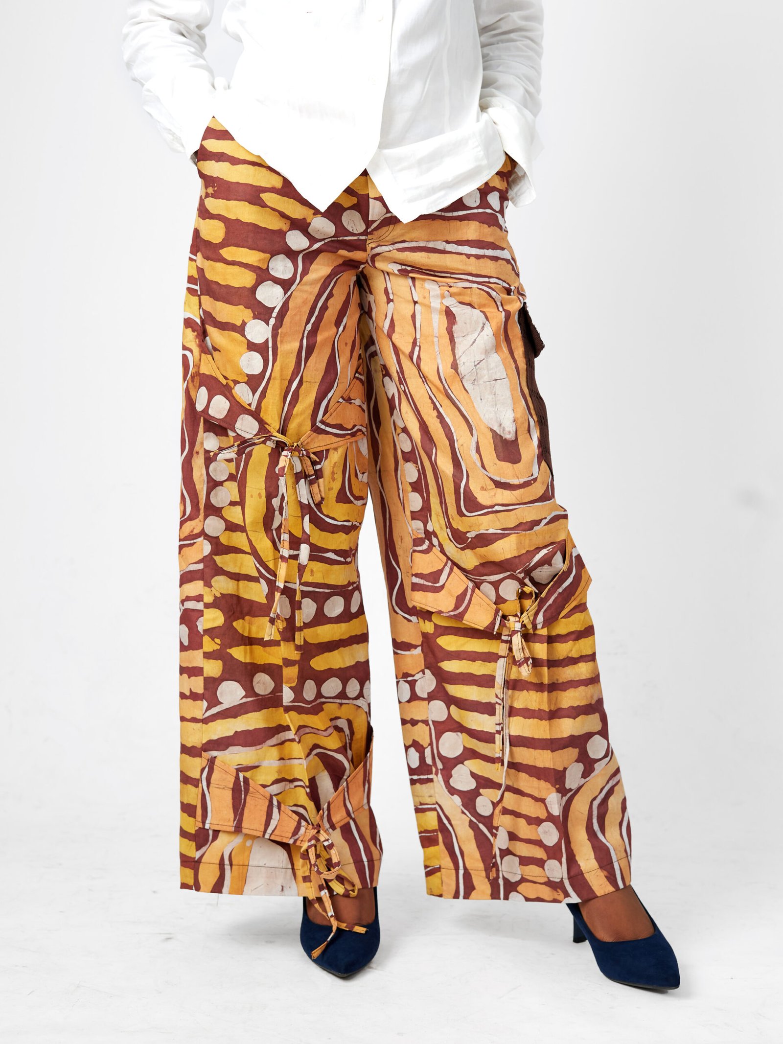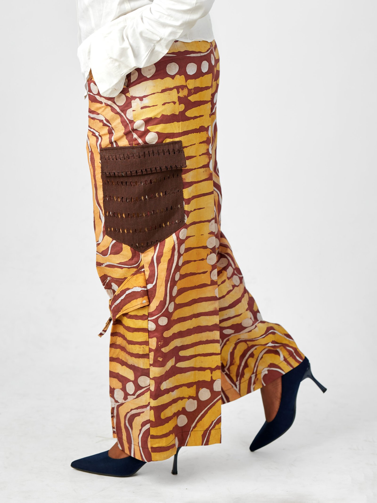 The signature side pocket, crafted from finely woven Aso Oke, adds a touch of heritage, while adjustable tie-knot details bring both function and flair.